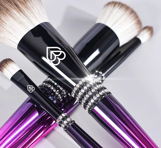 This 12pce makeup brush set is a must-have for any cosmetic collection. With a gradient design of black, purple and pink, and six inset rows of black and silver rhinestones, it exudes an elegant yet professional aesthetic. The soft but high quality tips ensure effortless application, making it the perfect addition to your beauty routine.